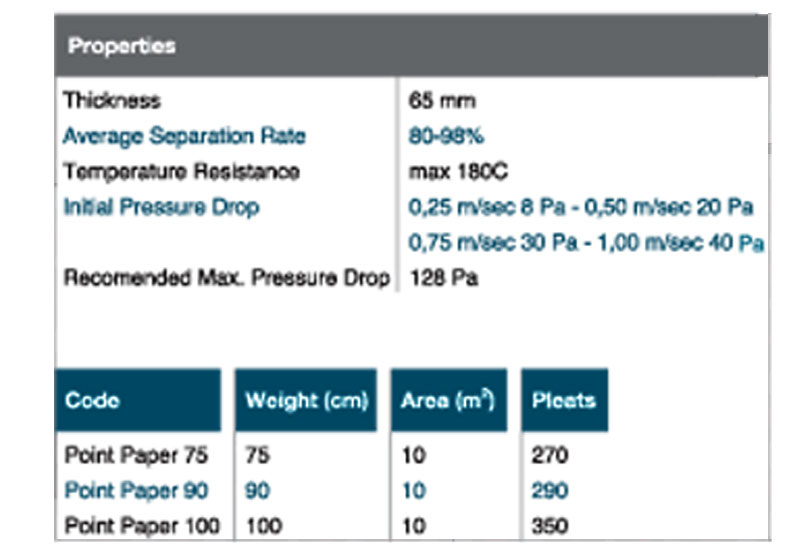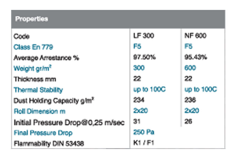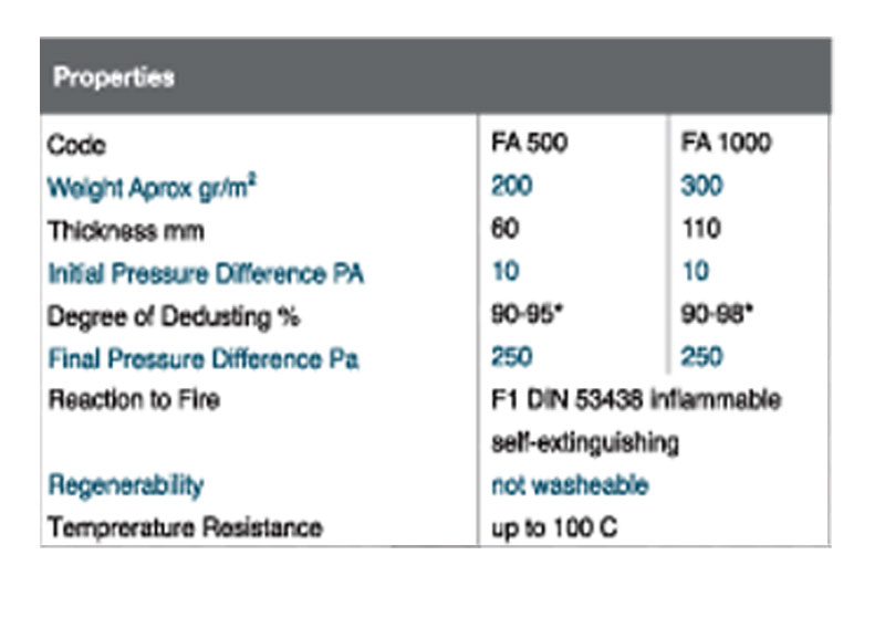 The special fine filter media are made of %100 polyester fibres progressively compressed, fortified with a plastic binder (or thermally) into a solid and stable filter lap. The material is saturated with a dust-binding agent.